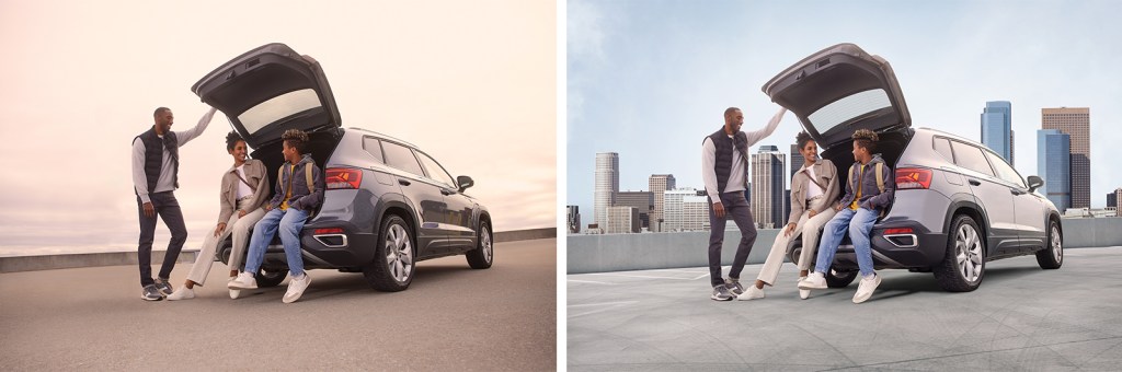 Image Composition. The car, floor, pillars, skyline and sky are all separate images that have been combined into one.