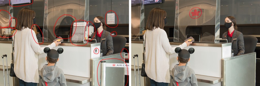 I removed various elements from the background (circled in red), added a logo to the plexiglass barrier.