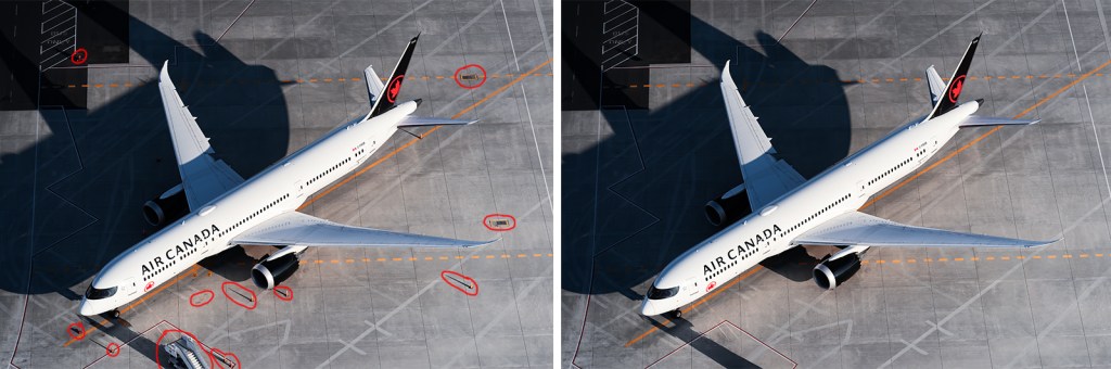 I removed pilons and shadows, cleaned up dirt marks on the floor, removed dirt and smudges from the top wings.