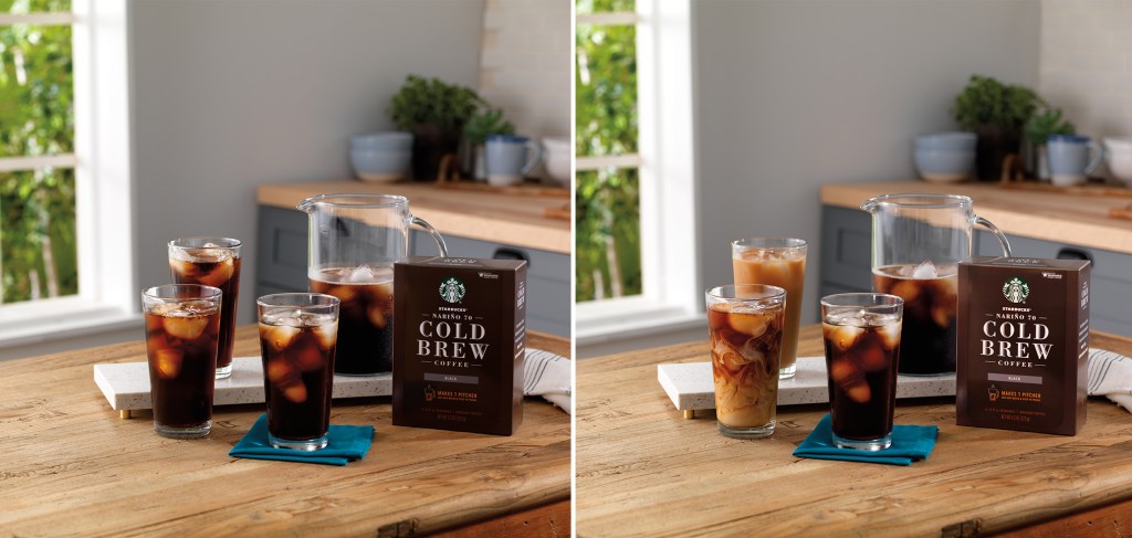 I clipped the products from the background and placed them on the new background and re-built the shadows. I also replaced them mug with the whip cream.