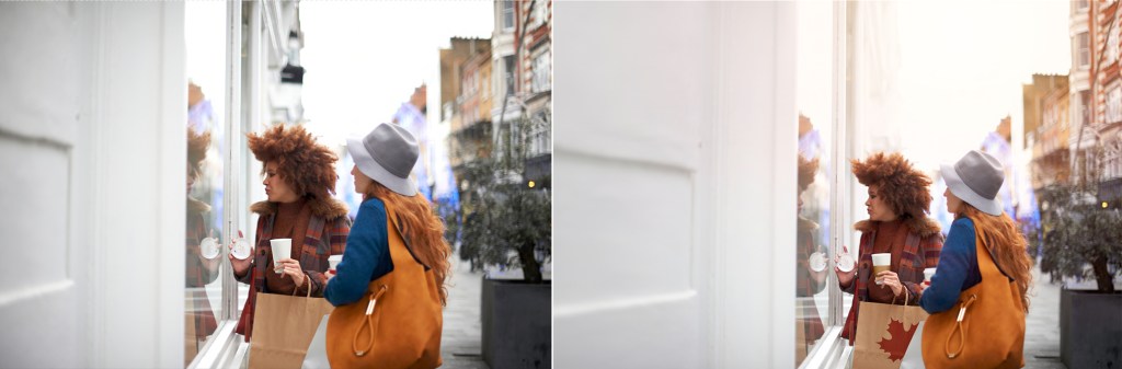 I extended the image on the left and top (including buildings), added a coffee sleeve, leaf to bag, retouched the hair, and added warmth.